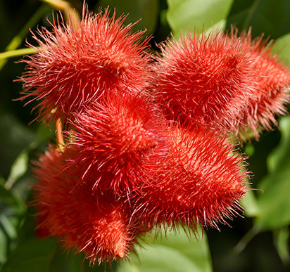 Le Roucou - Bixa orellana - également baptisé arbre à rouge à lèvres, comporte un colorant naturel : la bixine. Le fruit rouge du roucouyer, hérissé d'épines souples, contient des graines à la pulpe rouge orangé. Après séchage, ces graines produisent le colorant appelé bixine.